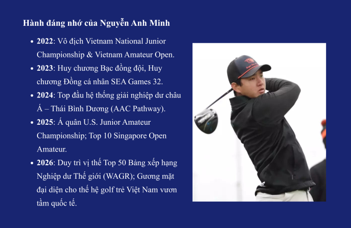 Bước sang năm 2026, Nguyễn Anh Minh không còn là một “hiện tượng” trẻ. Anh đang định vị mình là một trong những golfer nghiệp dư bản lĩnh nhất khu vực đang thi đấu tại Mỹ.