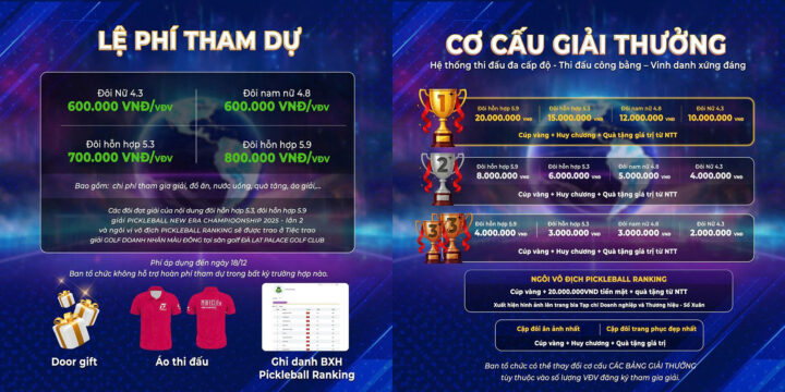 Lệ phí tham dự được xây dựng hợp lý, bao gồm chi phí thi đấu, nước uống, quà tặng và áo thi đấu chính thức của giải, đồng thời toàn bộ vận động viên tham gia đều được ghi nhận thành tích trên hệ thống Pickleball Ranking, gia tăng giá trị thi đấu và dấu ấn cá nhân.